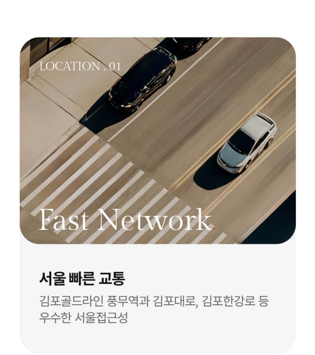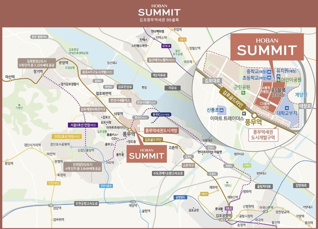 한강시네폴리스 IC, 김포한강로, 자유로, 올림픽도로, 수도권 제1순환도로 등 접근이 용이해 차량을 통해서 서울 및 수도권 전역으로 편리하게 이동 가능합니다. 또한 서울지하철 5호선 김포 연장 사업이 예비타당성 조사 중이며, 인천지하철 2호선 연장(2035년 예정), GTX-D 노선(2035년 예정) 등이 추진 중에 있습니다.